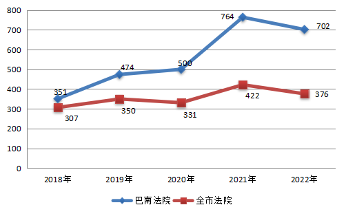 2022年,区法院在区委坚强领导、区人大及常委会有力监督、区政府、区政协及社会各界大力支持下,坚持以习近平新时代中国特色社会主义思想为指导,深入贯彻党的十九大、十九届历次全会和党的二十大精神,认真贯彻落实党中央决策部署、市委区委工作要求及区十九届人大一次会议精神,紧紧围绕为党的二十大胜利召开创造安全稳定的政治社会环境这一主线,坚持“讲政治、顾大局、重团结,高质量、高品质、重民生,依法依规、担当实干、重廉洁”,锚定法院“361”发展目标思路,忠实履行宪法法律赋予的职责使命。全年新收审判执行案件47709件,同比下降22.31%;审执结案件52003件,结案率93.96%;员额法官人均结案702件,位列全市法院第2。法院全面工作实现新发展、迈上新台阶,为服务保障巴南经济社会发展作出新的贡献。