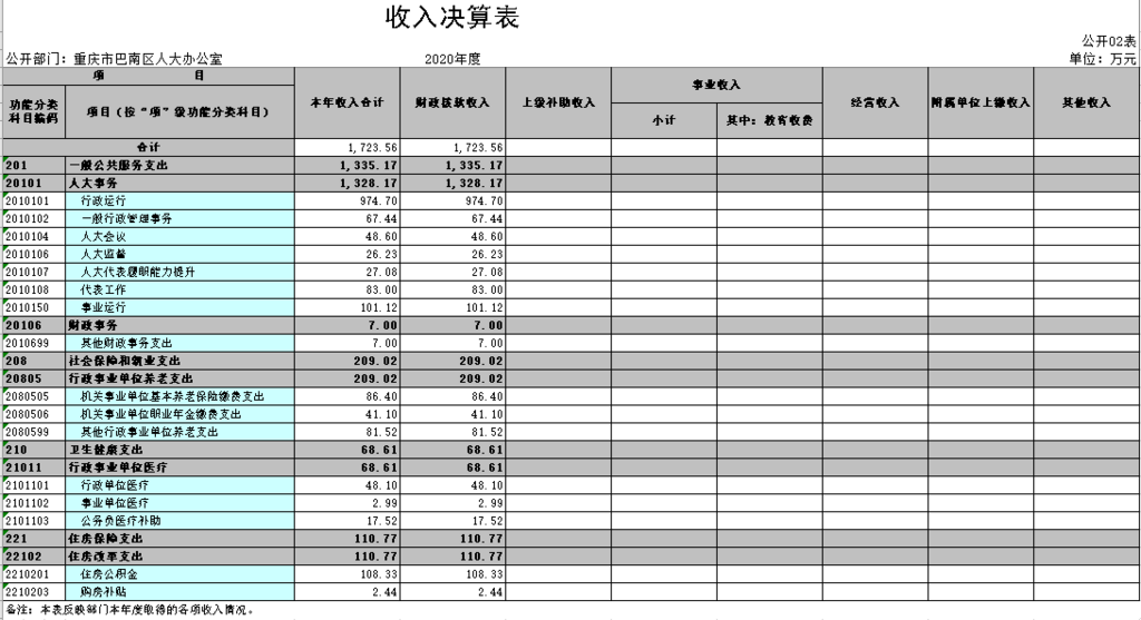 2.收入情况。2020年度收入合计1723.56万元,较上年决算数减少358.15万元,下降17.2%,主要原因:减少了其它工资福利支出(2019年度的目标考核奖)和人员经费。其中:财政拨款收入1723.56万元,占100%。