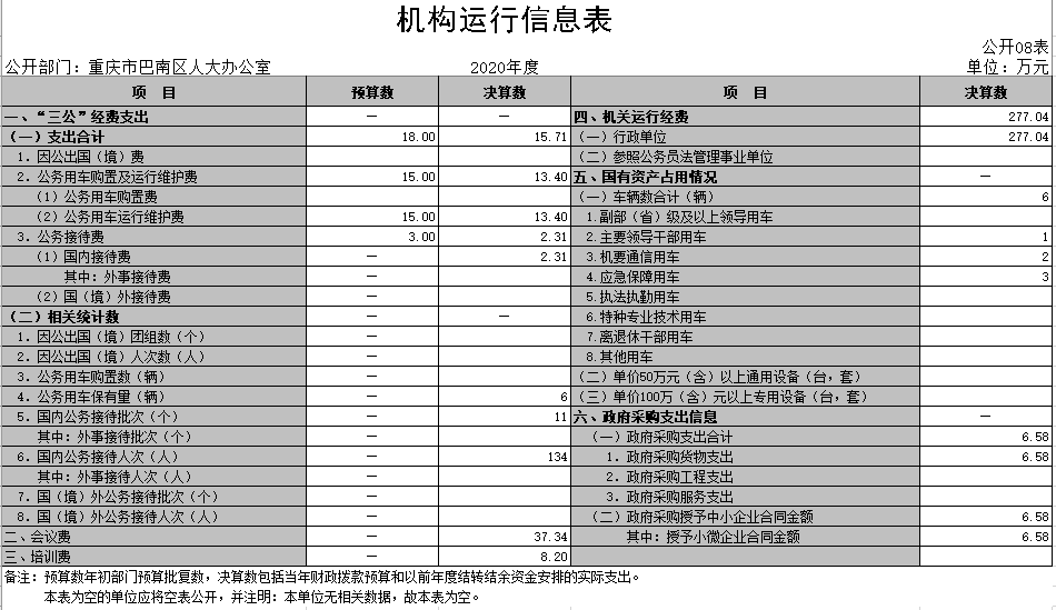 (一)机关运行经费情况说明。2020年度本部门机关运行经费支出277.04万元,机关运行经费主要用于开支办公费、公务车运行维护费、信息网络购置更新费、差旅费等。 机关运行经费较上年决算数减少114.32万元,下降29.2%,主要原因是今年在财政要求下,严格执行压缩一般公用经费之规定,减少会议费、培训费等支出,厉行节约。