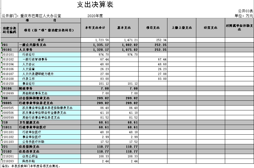3.支出情况。2020年度支出合计1723.56万元,较上年决算数减少358.15万元,下降17.2%,主要原因:减少了其它工资福利支出(2019年度的目标考核奖)和人员经费。其中:基本支出 1471.21万元,占85.4%;项目支出252.34万元,占14.6%。