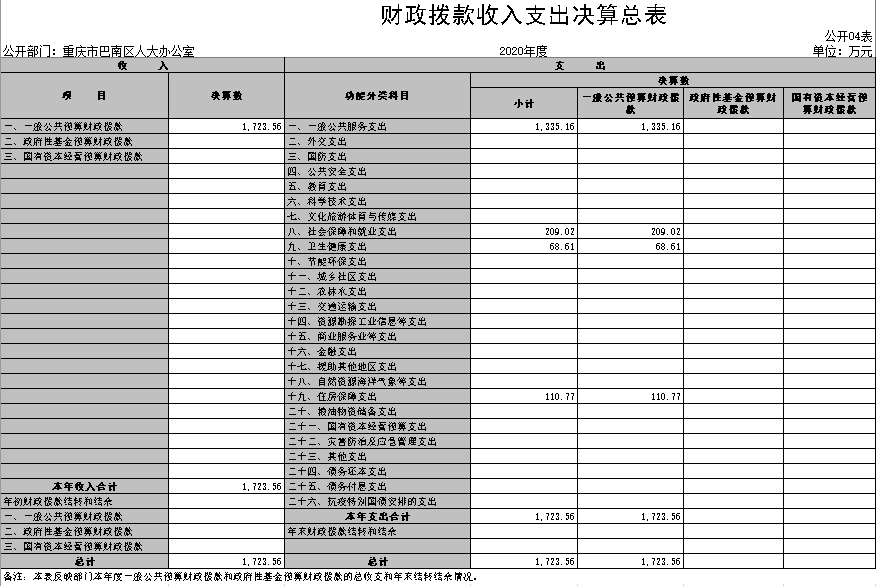 1.总体情况。2020年度收入总计1723.56万元,支出总计1723.56万元。收支较上年决算数 减少358.15万元、 下降 17.2%,主要原因:减少了其它工资福利支出(2019年度的目标考核奖)和人员经费。